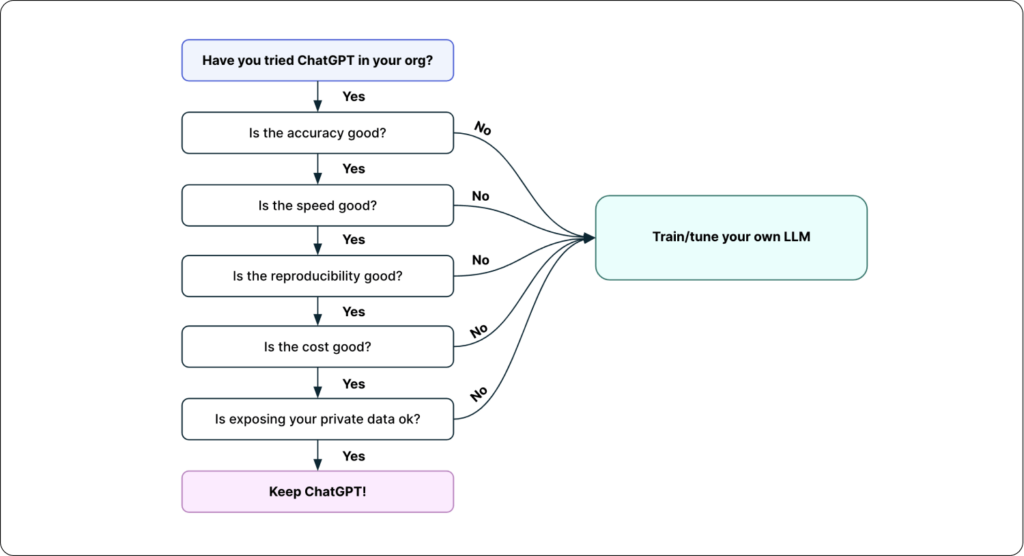 For starters, just a few of the questions you need to ask yourself are: Is the model’s accuracy good enough? Do I have enough training data for my specific use case? Is it fast enough? Is it reproducible, such that I get consistent results for the same prompts? Is the quality high enough over time? Do the economics of the model work?