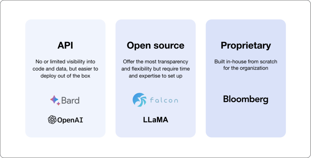 Today’s marketplace offers a gamut of options—open-source models, proprietary ones, or models-as-a-service. We’re already seeing excellent open-source models being released, like Falcon and Meta’s Llama 2. And recent news about proprietary models, like Bloomberg GPT, has surfaced. Businesses need to weigh the benefits of training on proprietary data against fine-tuning pre-existing giants; it all boils down to what’s right for your specific use case.