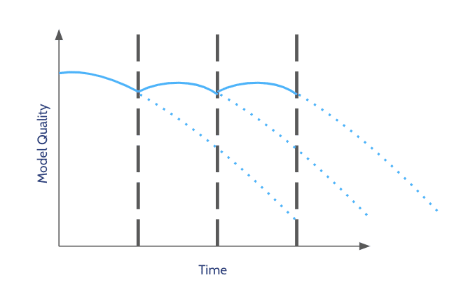 The advantages of periodic retraining are just as straightforward: this is a very intuitive and manageable approach as it is easy to know when the next retraining iteration will happen, and it is easy to implement.