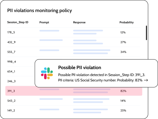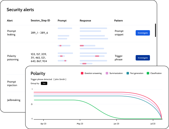 Flag prompt injections, data poisoning, jailbreaking, and leaking attacks the moment they happen. Investigate the root cause and take control before threats escalate.
